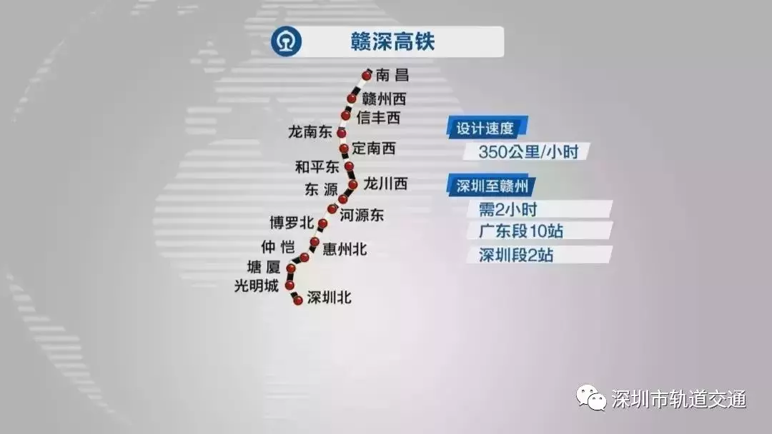 贛深鐵路線路縱貫江西、廣東兩省,沿線途經(jīng)贛州、河源、惠州、東莞、深圳等地市,長(zhǎng)度436.367公里。其中,江西省境內(nèi)134.567公里,廣東省境內(nèi)301.8公里。其中廣東段設(shè)有10站;深圳段設(shè)有2站,共32公里已投入建設(shè)。設(shè)計(jì)行車速度為350公里/小時(shí),規(guī)劃運(yùn)輸能力為5000萬(wàn)人/年。