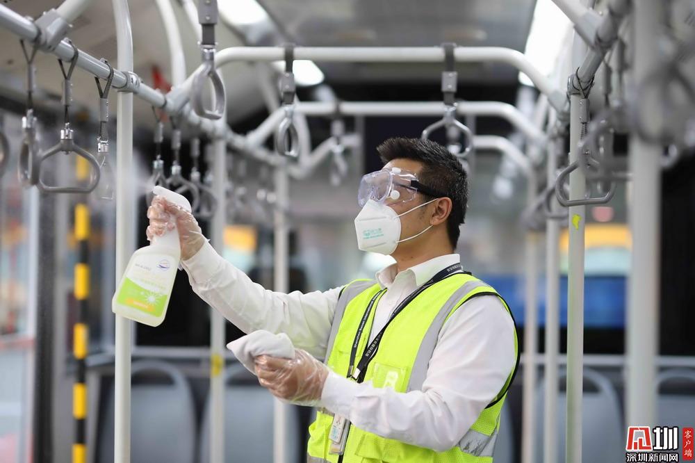 工作人員對(duì)機(jī)場(chǎng)擺渡車進(jìn)行消殺。