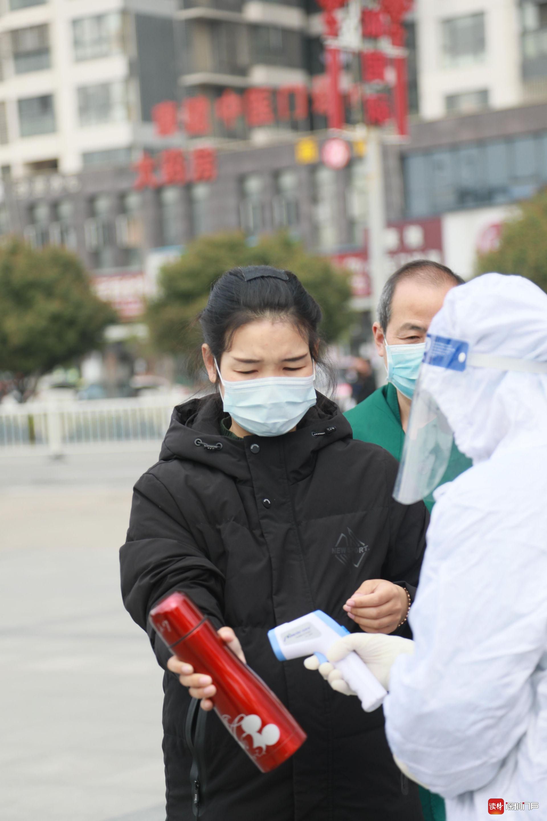 2月16日,監(jiān)利縣人民醫(yī)院,接受體溫檢測(cè)的當(dāng)?shù)厝罕姟?/p>