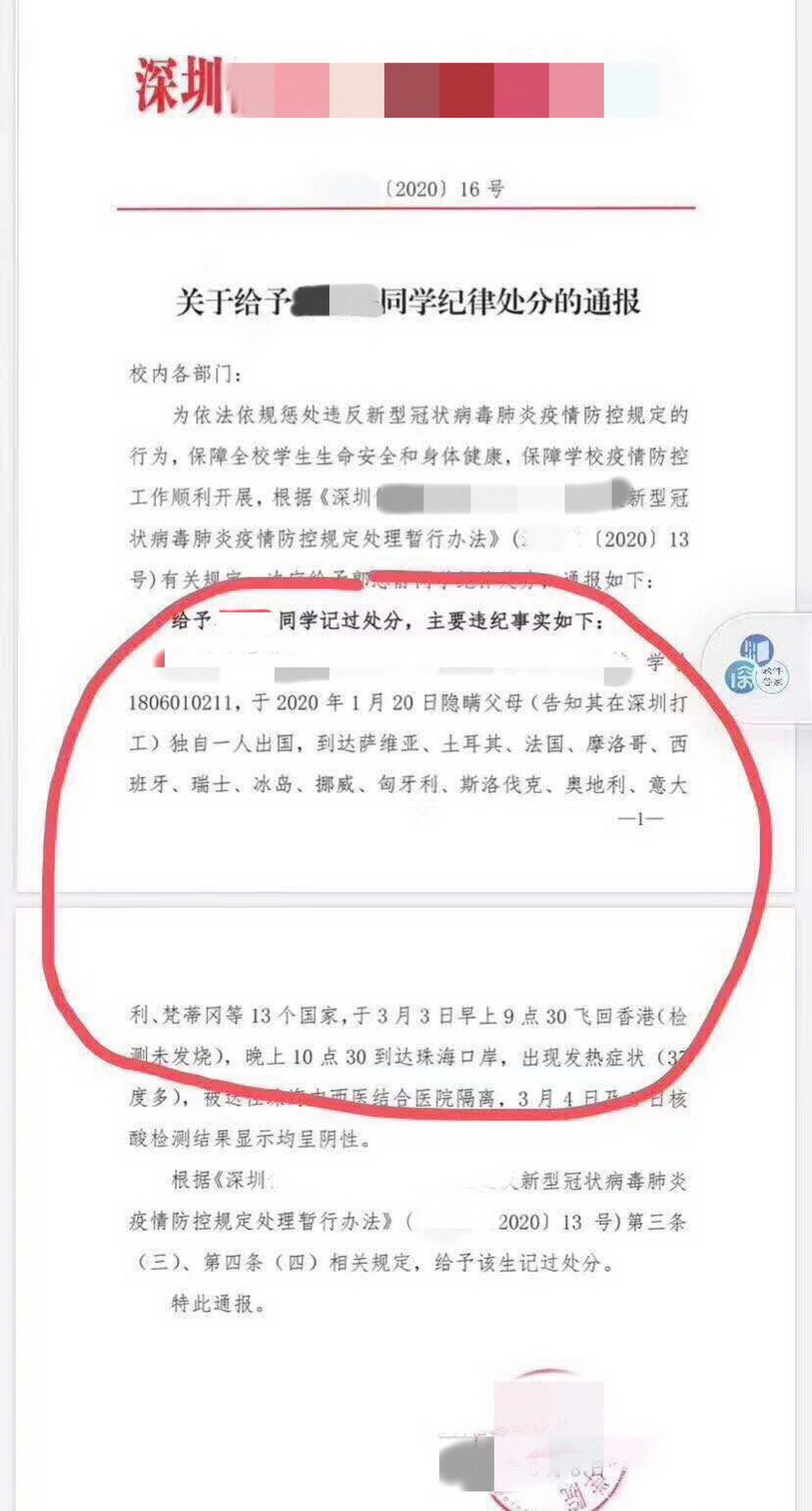 3月3日,小Y從珠海入境回國(guó),在過(guò)海關(guān)時(shí)出現(xiàn)發(fā)燒癥狀并送往珠海中西醫(yī)結(jié)合醫(yī)院進(jìn)行隔離檢測(cè)。“在過(guò)關(guān)的時(shí)候需要填寫旅行史,我如實(shí)填寫了,因?yàn)樵?jīng)到過(guò)意大利等國(guó)家所以海關(guān)會(huì)重點(diǎn)監(jiān)測(cè)我。因?yàn)樽陨砻庖吡Φ停约暗箷r(shí)差的原因,有些感冒低燒,但我也沒(méi)有隱瞞什么,如實(shí)闡述了我的行程和身體狀況,也很配合海關(guān)人員的調(diào)查?!?月4日、5日,當(dāng)事人核酸檢測(cè)結(jié)果均為陰性,由于違反定瞞報(bào)行程,小Y被學(xué)校予以記過(guò)處分。對(duì)于學(xué)校的處分決定,她坦言接受?!拔覜](méi)有如實(shí)向?qū)W校匯報(bào)我的行程,我接受學(xué)校對(duì)我的處分?!?/p>