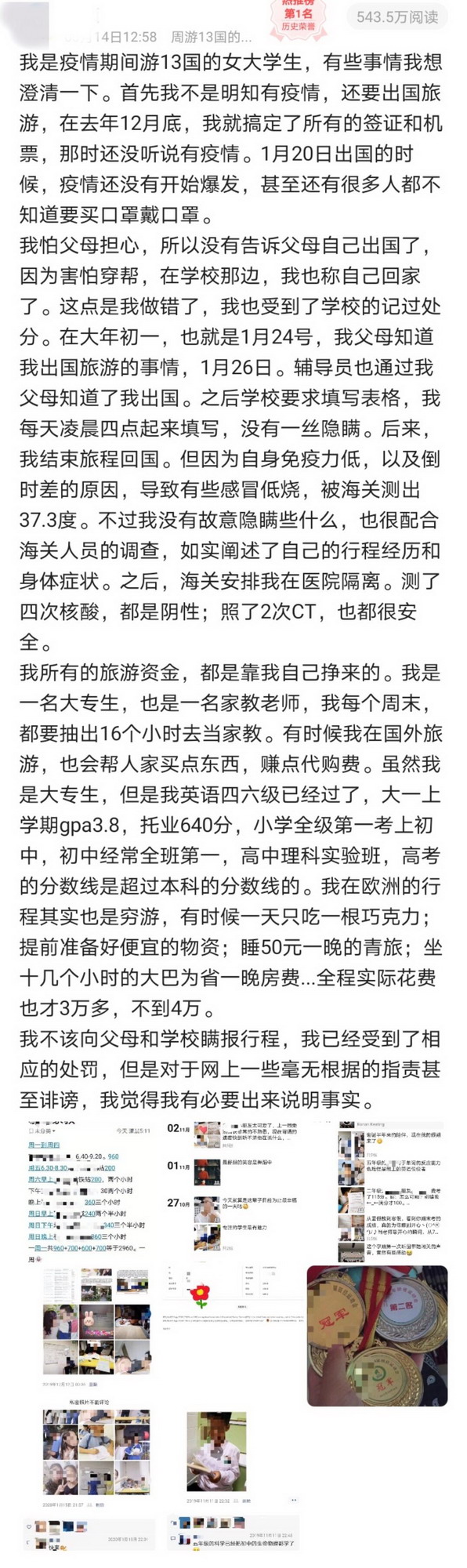 記者從小Y處了解到,1月20日,她出發(fā)開(kāi)始旅行并于3月3日從珠海入境回國(guó),期間共游玩13個(gè)國(guó)家。“10月份就已經(jīng)決定出去玩,11月一直在準(zhǔn)備簽證,12月中旬簽證什么的都已經(jīng)準(zhǔn)備好了。”由于害怕父母擔(dān)心她一人在外旅行的安全問(wèn)題,出發(fā)時(shí)并沒(méi)有告知父母?!?月23日,學(xué)校要求所有學(xué)生填寫一個(gè)假期所在地,我填寫的是‘在家’,因?yàn)椴幌胱尲依锶酥牢以趪?guó)外,害怕穿幫。出發(fā)時(shí)國(guó)內(nèi)疫情還沒(méi)有爆發(fā),所以不是很清楚國(guó)內(nèi)的疫情,也沒(méi)想到填這個(gè)信息是為了防控疫情所用,所以沒(méi)有如實(shí)填寫。大年初一,也就是1月24日,我父母知道了我出國(guó)的事,對(duì)我嚴(yán)厲批評(píng)。之后學(xué)校要求填寫表格,我沒(méi)有隱瞞,都是如實(shí)填寫。”