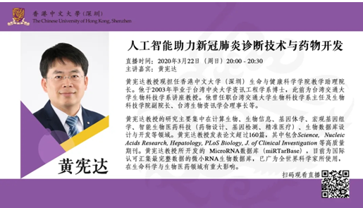 黃憲達(dá)教授現(xiàn)擔(dān)任香港中文大學(xué)(深圳)生命與健康科學(xué)學(xué)院教學(xué)助理院長(zhǎng)、瓦謝爾計(jì)算生物研究院執(zhí)行院長(zhǎng)。他于2003年畢業(yè)于臺(tái)灣中央大學(xué)資訊工程學(xué)系博士,此前為臺(tái)灣交通大學(xué)生物科技學(xué)系講座教授。他曾任職臺(tái)灣交通大學(xué)生物科技學(xué)系主任及生物科技學(xué)院副院長(zhǎng)、臺(tái)灣生物資訊學(xué)會(huì)理事長(zhǎng)等。