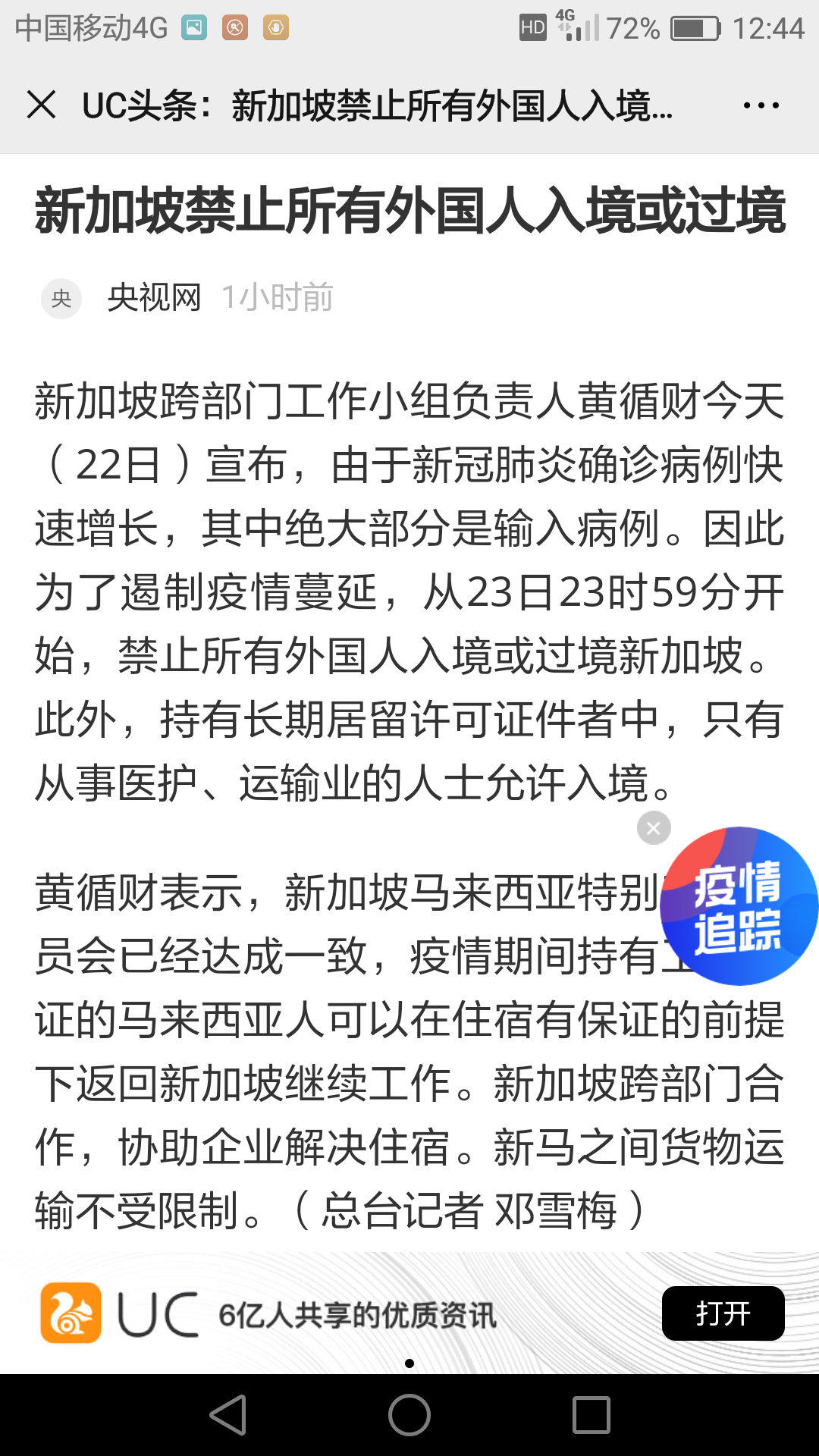 今日早些時候,據(jù)央視網(wǎng)報(bào)道,新加坡跨部門工作小組負(fù)責(zé)人宣布,為遏制疫情蔓延,從23日23時59分開始,禁止所有外國人入境或過境新加坡。同時,持有長期居留許可證件者中,也只有從事醫(yī)護(hù)、運(yùn)輸業(yè)的人士允許入境。(記者蔡良煥)