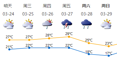 27-28日受冷空氣影響,有一次雷雨過程,28日氣溫略降;