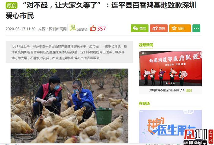 深圳新聞網(wǎng)愛心助農(nóng)的報(bào)道推出后,得到深圳各界和愛心市民的踴躍參與,大家紛紛通過報(bào)道中公布的微店訂購愛心雞。突然猛增的訂單,讓連平農(nóng)民感動(dòng)的同時(shí),也倍感壓力,因?yàn)榘傧汶u都是現(xiàn)殺現(xiàn)寄,全程冷鏈配送,所以導(dǎo)致有些訂單滯后。3月17日,連平農(nóng)戶還通過深圳新聞網(wǎng)向深圳愛心市民發(fā)出致歉信--《“對(duì)不起,讓大家久等了”:連平縣百香雞基地致歉深圳愛心市民》,通過深圳新聞網(wǎng)向深圳愛心市民表示謝意的同時(shí),又表達(dá)歉意。