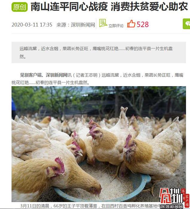 今年新冠肺炎疫情發(fā)生以后,南連農(nóng)業(yè)對(duì)口幫扶的河源連平四個(gè)基地受到影響,共有近2萬只百香雞待銷,其中連平縣田源鎮(zhèn)田西村基地的6000多只百香雞無人問津。就在村民一籌莫展的時(shí)候,深圳新聞網(wǎng)等媒體知曉后,迅速進(jìn)行深度采訪,3月11日刊發(fā)了《南山連平同心戰(zhàn)疫 消費(fèi)扶貧愛心助農(nóng)》的報(bào)道,呼吁深圳的企事業(yè)單位以及愛心市民,通過“以購代捐”“以買代幫”的方式參與消費(fèi)扶貧,幫助連平農(nóng)戶們渡過難關(guān)。