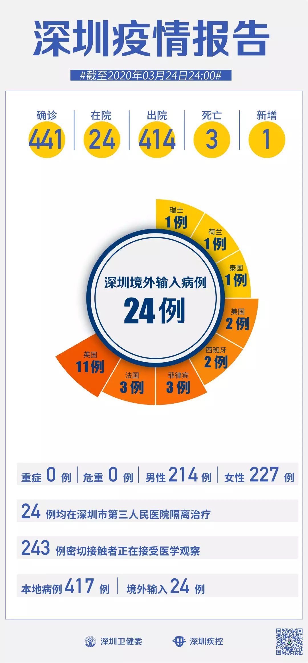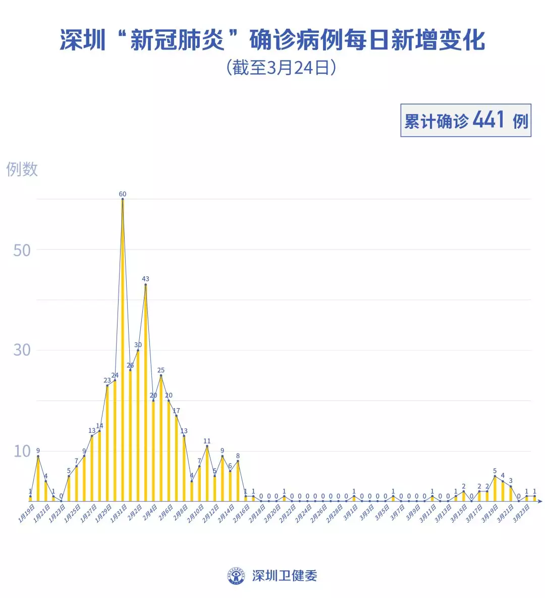 截至3月24日24時,深圳累計報告“新冠肺炎”病例441例。3月24日當天新增1例。