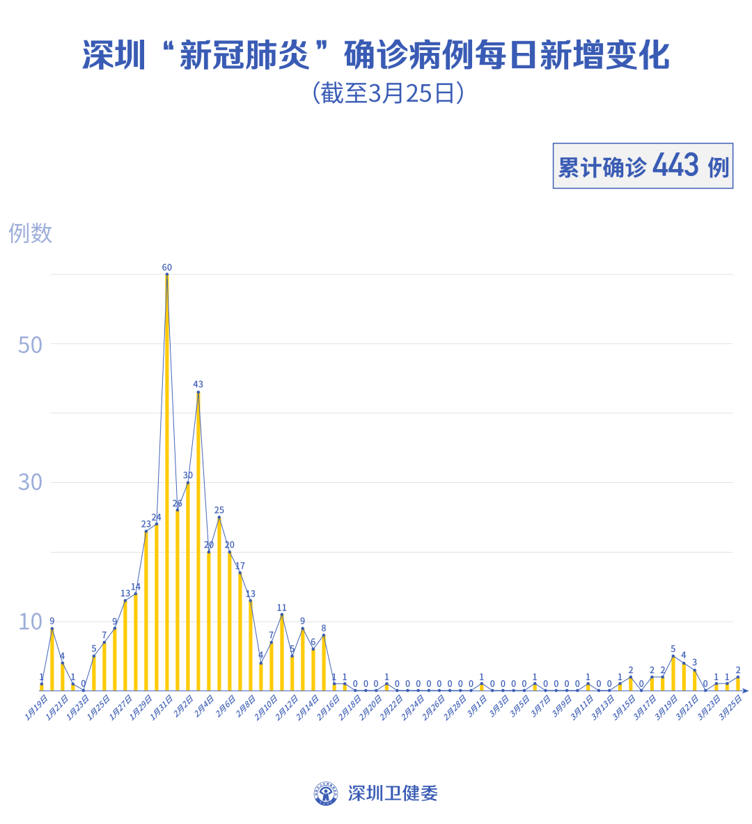 截至3月25日24時,深圳累計(jì)報告“新冠肺炎”病例443例。3月25日當(dāng)天新增2例,出院1例。