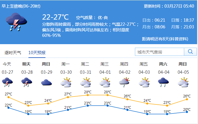 見圳客戶端·深圳新聞網3月27日訊 當前,我市進入強降雨和強對流天氣多發(fā)季節(jié)。氣象部門預計,27-28日受高空槽和冷空氣影響,有一次雷雨過程,并伴有短時強降水和8-9級短時大風等強對流天氣,28日氣溫下降3℃左右;29日云量較多,有分散小雨。市防汛防旱防風指揮部辦公室昨天發(fā)出通告,提醒各區(qū)、各有關單位提前做好局地強對流天氣防范工作。