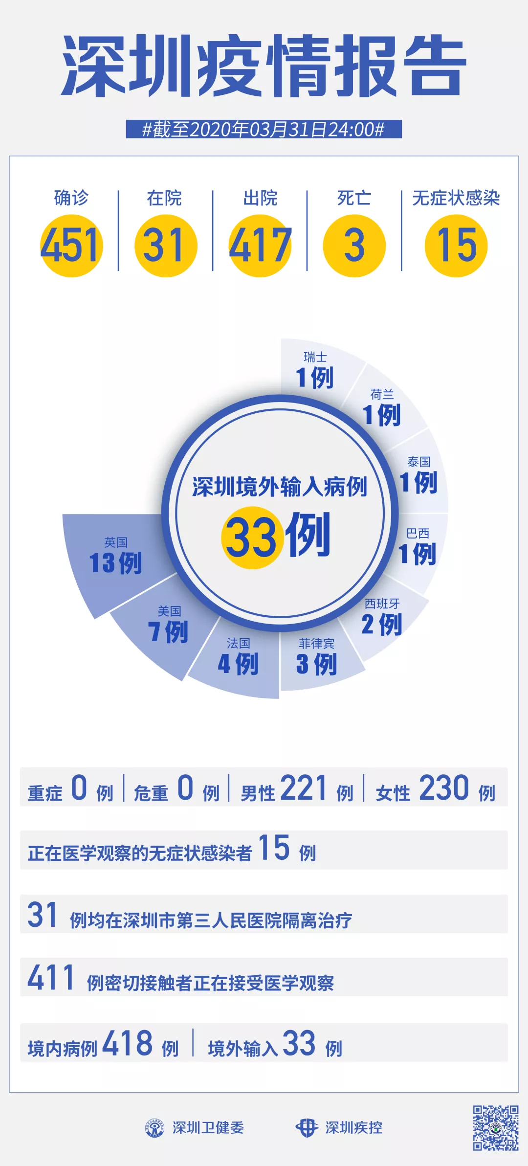 截至3月31日24時(shí),深圳累計(jì)報(bào)告新冠肺炎病例451例。3月31日當(dāng)天新增境內(nèi)病例1例、無癥狀感染者1例。 【境內(nèi)病例】:新增1例湖北返深確診病例,出院1例,累計(jì)報(bào)告境內(nèi)病例418例。 【境外輸入】:當(dāng)日無新增病例,累計(jì)報(bào)告境外輸入病例33例。 【無癥狀感染者】:新增1例湖北返深無癥狀感染者。全市尚在醫(yī)學(xué)觀察的無癥狀感染者15例,其中境外輸入9例。 累計(jì)報(bào)告確診病例中,男性221例、女性230例。 目前,死亡3例,累計(jì)出院417例。31例確診病例均在深圳市第三人民醫(yī)院隔離治療。 411名密切接觸者正在接受醫(yī)學(xué)觀察。 無癥狀感染者7問7答 01.什么是新型冠狀病毒無癥狀感染者? 新冠病毒無癥狀感染者(以下簡稱無癥狀感染者)是指無相關(guān)臨床癥狀,如發(fā)熱、咳嗽、咽痛等可自我感知或可臨床識(shí)別的癥狀與體征,但呼吸道等標(biāo)本新冠病毒病原學(xué)檢測陽性者。無癥狀感染者可分為兩種情形: 一是感染者核酸檢測陽性,經(jīng)過14天潛伏期的觀察,均無任何可自我感知或可臨床識(shí)別的癥狀與體征,始終為無癥狀感染狀態(tài); 二是感染者核酸檢測陽性,采樣時(shí)無任何可自我感知或可臨床識(shí)別的癥狀與體征,但隨后出現(xiàn)某種臨床表現(xiàn),即處于潛伏期的“無癥狀感染”狀態(tài)。 02.無癥狀感染者有無傳染性? 根據(jù)國家和部分省份開展的密切接觸者監(jiān)測數(shù)據(jù),無癥狀感染者的密切接觸者存在二代病例續(xù)發(fā),流行病學(xué)調(diào)查中發(fā)現(xiàn)個(gè)別由無癥狀感染者導(dǎo)致的聚集性疫情,有小樣本量的研究顯示無癥狀感染者呼吸道樣本中的病毒載量與確診病例沒有太大差異。 綜合目前的監(jiān)測和研究,無癥狀感染者存在傳染性,但其傳染期長短、傳染性強(qiáng)弱、傳播方式等尚需開展進(jìn)一步科學(xué)研究。 部分專家認(rèn)為鑒于無癥狀感染者的呼吸道標(biāo)本能檢出病原核酸,但由于無咳嗽、打噴嚏等臨床癥狀,病原排出體外引起傳播的機(jī)會(huì)較確診病例相對少一些。 03.我國關(guān)于新型冠狀病毒無癥狀感染者的防控要求是什么? 國家衛(wèi)生健康委在1月28日發(fā)布《新冠病毒感染的肺炎防控方案》(第三版)中就將新型冠狀病毒無癥狀感染者納入防控管理,在其后的修訂過程中均對無癥狀感染者的報(bào)告、管理等提出了明確具體的要求。各級各類醫(yī)療衛(wèi)生機(jī)構(gòu)發(fā)現(xiàn)無癥狀感染者,應(yīng)于2小時(shí)內(nèi)進(jìn)行網(wǎng)絡(luò)直報(bào)。 縣(區(qū))級疾控機(jī)構(gòu)接到無癥狀感染者報(bào)告后,24小時(shí)內(nèi)完成個(gè)案調(diào)查,并及時(shí)進(jìn)行密切接觸者登記,將個(gè)案調(diào)查表或調(diào)查報(bào)告及時(shí)通過傳染病報(bào)告管理信息系統(tǒng)進(jìn)行上報(bào)。 無癥狀感染者應(yīng)集中隔離14天,原則上集中隔離滿14天且兩次連續(xù)標(biāo)本核酸檢測陰性者(采樣時(shí)間至少間隔24小時(shí))可解除隔離; 如果核酸檢測仍為陽性者,則繼續(xù)隔離醫(yī)學(xué)觀察。 隔離醫(yī)學(xué)觀察期間如出現(xiàn)臨床表現(xiàn),應(yīng)及時(shí)轉(zhuǎn)歸為確診病例,進(jìn)行規(guī)范治療。 無癥狀感染者密切接觸者也要進(jìn)行14天的集中隔離醫(yī)學(xué)觀察。 04.無癥狀感染者通過什么途徑發(fā)現(xiàn)?截至目前我國發(fā)現(xiàn)了多少例無癥狀感染者? 目前我們主要通過以下途徑主動(dòng)發(fā)現(xiàn)無癥狀感染者: 一是對新型冠狀病毒肺炎病例的密切接觸者開展醫(yī)學(xué)觀察期間的主動(dòng)檢測; 二是在聚集性疫情調(diào)查中開展的主動(dòng)檢測; 三是在新型冠狀病毒肺炎病例的傳染源追蹤過程中對暴露人群主動(dòng)檢測; 四是對部分有境內(nèi)外新型冠狀病毒肺炎病例持續(xù)傳播地區(qū)的旅行史和居住史人員開展主動(dòng)檢測。 05.如何做好無癥狀感染者的風(fēng)險(xiǎn)評估及其防控? 無癥狀感染者存在著傳播風(fēng)險(xiǎn)。 一是傳播的隱匿性。由于無癥狀感染者無任何明顯的癥狀與體征,其在人群中難以被發(fā)現(xiàn),其導(dǎo)致的傳播也難以預(yù)防。 二是癥狀的主觀性。癥狀輕微或不典型者可能認(rèn)為自己沒有感染新冠病毒,不主動(dòng)去醫(yī)療機(jī)構(gòu)就診,在日常的診療工作中難以被發(fā)現(xiàn)。 三是發(fā)現(xiàn)的局限性。由于存在檢測窗口期,采用核酸檢測和血清學(xué)檢測方法難以發(fā)現(xiàn)全部無癥狀感染者,現(xiàn)有的無癥狀感染者主要是通過病例的密切接觸者主動(dòng)篩查、感染來源調(diào)查、聚集性疫情調(diào)查和對高風(fēng)險(xiǎn)地區(qū)人員的主動(dòng)檢測發(fā)現(xiàn)的,尚有部分無癥狀感染者難以被發(fā)現(xiàn)。 為此,要突出做好無癥狀感染者監(jiān)測,有針對性加大篩查力度,將檢測范圍擴(kuò)大至已發(fā)現(xiàn)病例和無癥狀感染者的密切接觸者、重點(diǎn)地區(qū)和重點(diǎn)人群等。一旦發(fā)現(xiàn)無癥狀感染者,要立即按“四早”要求,嚴(yán)格集中隔離和醫(yī)學(xué)觀察,對密切接觸者也要實(shí)施隔離醫(yī)學(xué)觀察。 由于部分無癥狀感染者始終無癥狀,實(shí)際防控工作中無法將發(fā)現(xiàn)和隔離無癥狀感染者