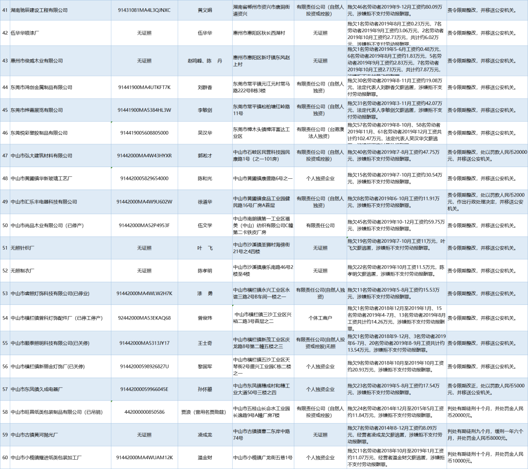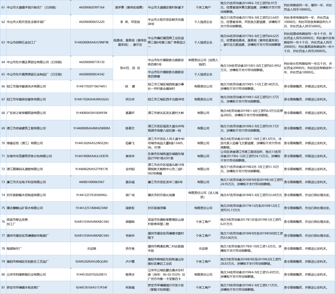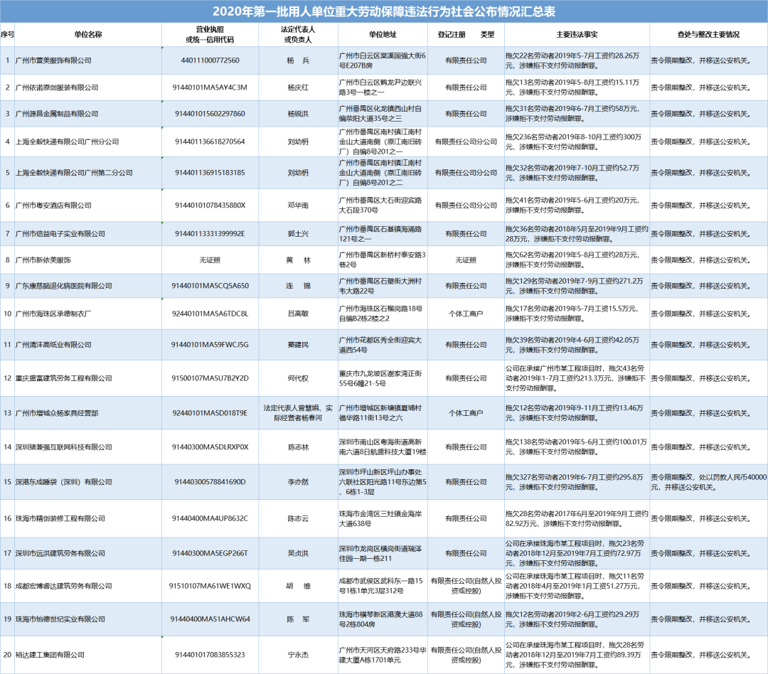 為加強對違法用人單位的社會監(jiān)督,強化誠信體系建設,加大威懾力,依據(jù)《廣東省用人單位重大勞動保障違法行為社會公布暫行規(guī)定》,省人社廳公布2020年第一批重大違法案件,涉及81家企業(yè),其中深圳豬兼強互聯(lián)網科技有限公司拖欠138名勞動者2019年5-6月工資約100.01萬元,涉嫌拒不支付勞動報酬罪,被責令限期整改,并移送公安機關。深港東成睡袋(深圳)有限公司拖欠327名勞動者2019年6-7月工資約295.8萬元,涉嫌拒不支付勞動報酬罪,被責令限期整改,處以罰款人民幣4萬元,并移送公安機關。