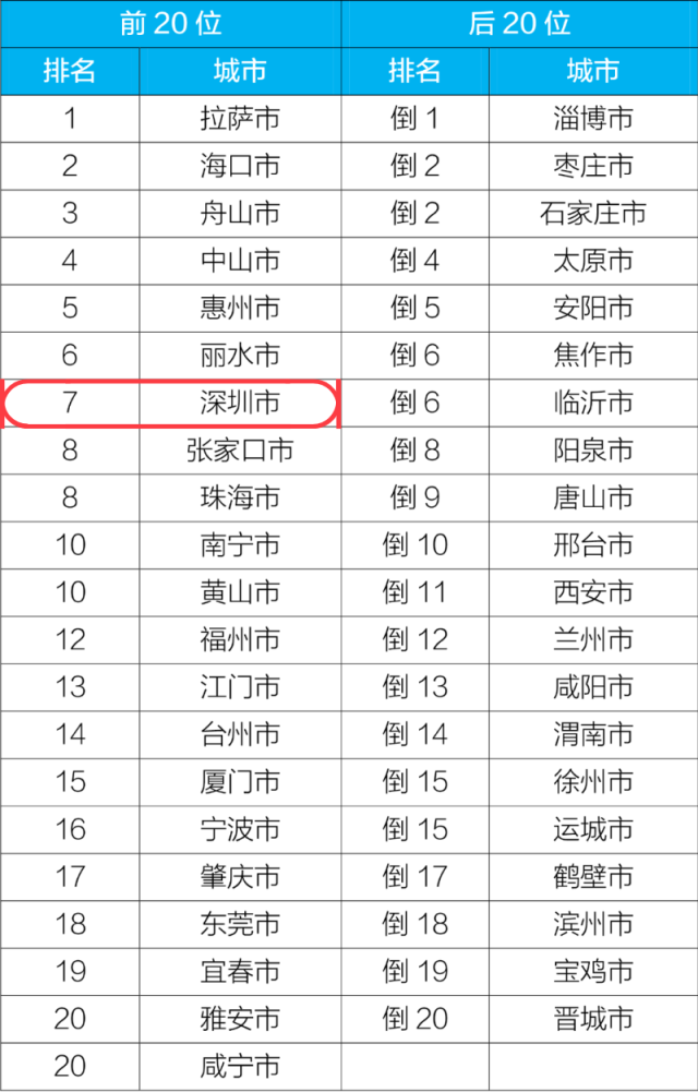 1-3月,168個重點城市中包頭、石家莊、臨汾市等城市空氣質(zhì)量相對較差(從倒數(shù)第1名至倒數(shù)第20名);海口、拉薩、麗水市等城市空氣質(zhì)量相對較好,深圳排名第6。