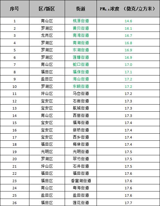 空氣質(zhì)量排名前十的街道是:桃源街道、黃貝街道、南灣街道、南湖街道、東湖街道、蓮塘街道、蛇口街道、福保街道、海山街道和東曉街道;空氣質(zhì)量排名倒數(shù)十位的街道是:馬田街道、新安街道、觀瀾街道、筍崗街道、園嶺街道、福城街道、沙井街道、沙河街道、華強(qiáng)北街道和大浪街道。