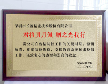 “君將明月佩,贈之光我行”,接收物資后,寶安區(qū)教育局為長盈精密公司贈送題詞牌匾,以表示對該公司在防疫關(guān)鍵時(shí)期慷慨解囊,支援教育系統(tǒng)抗擊疫情工作的感謝和敬意。