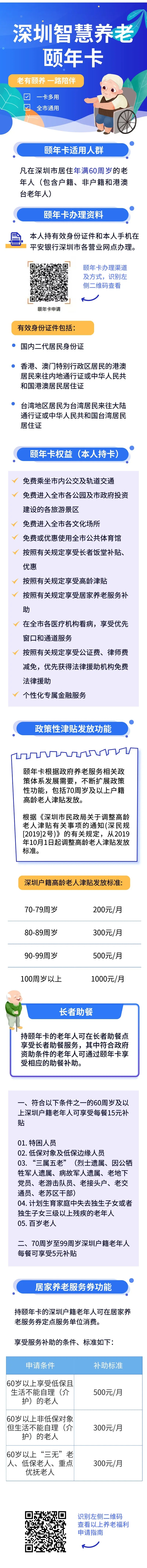 據(jù)悉,凡在深圳市居住年滿60周歲以上的老年人(包含港澳臺老年人),均可持有效身份證件和手機申請辦理?!邦U年卡”持卡人,可享受敬老優(yōu)待,包括免費進入全市各公園,免費進入市政府投資建設(shè)各旅游景區(qū),免費乘坐市內(nèi)公交車和軌道交通。70周歲及以上戶籍老人還可享受高齡津貼發(fā)放;符合規(guī)定的戶籍老年人可享受居家養(yǎng)老消費的優(yōu)惠和補貼,包括:生活照料、家政服務(wù)、康復護理服務(wù)、日托服務(wù)、心理咨詢等。