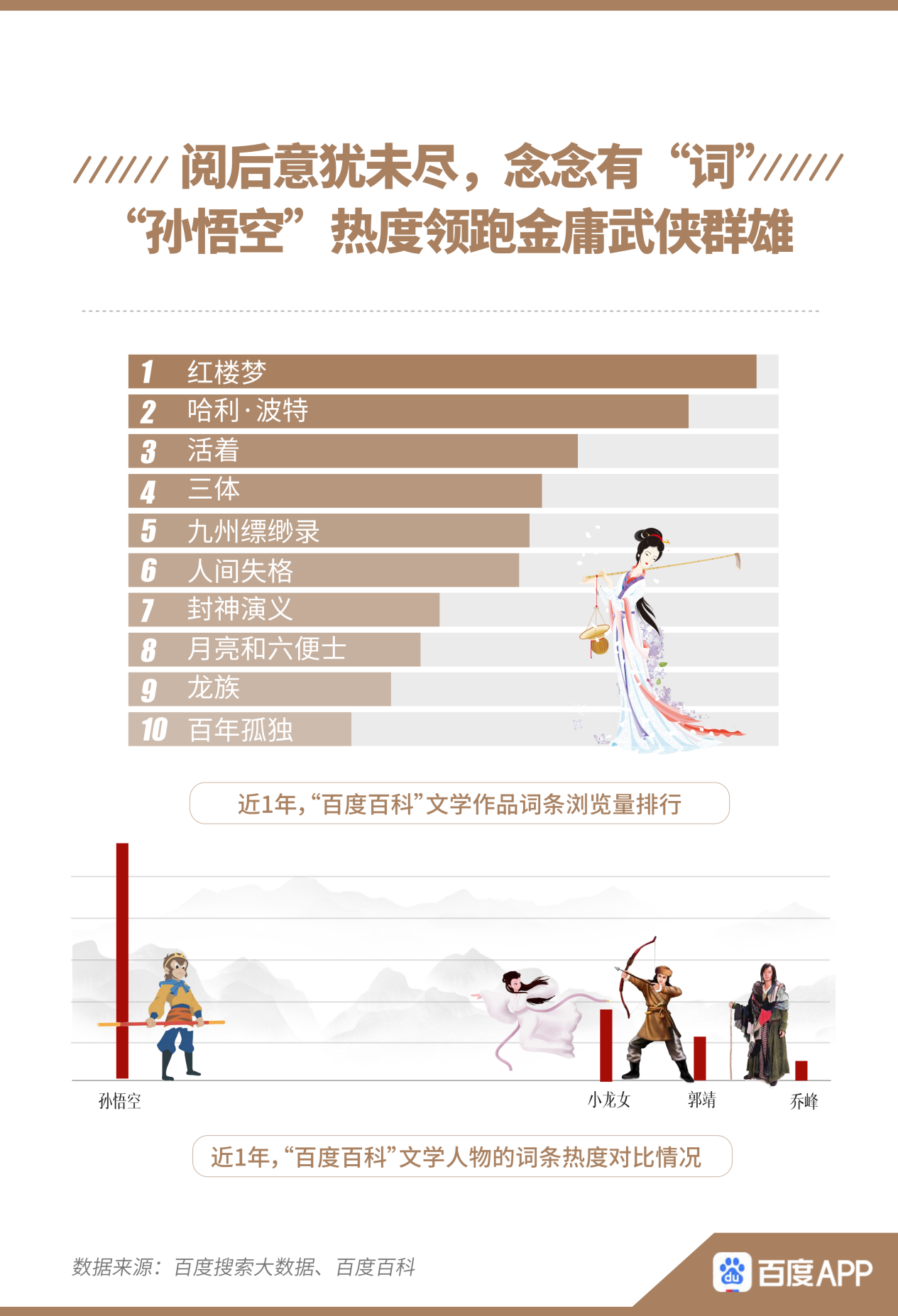而百度百科的數(shù)據(jù)表明,人們在閱讀經(jīng)典書籍后,點擊詞條查看更多背景、釋義也是常態(tài)。《紅樓夢》、《哈利·波特》、《活著》、《三體》是近1年來網(wǎng)友在百度百科瀏覽較多的文學作品相關(guān)詞條。