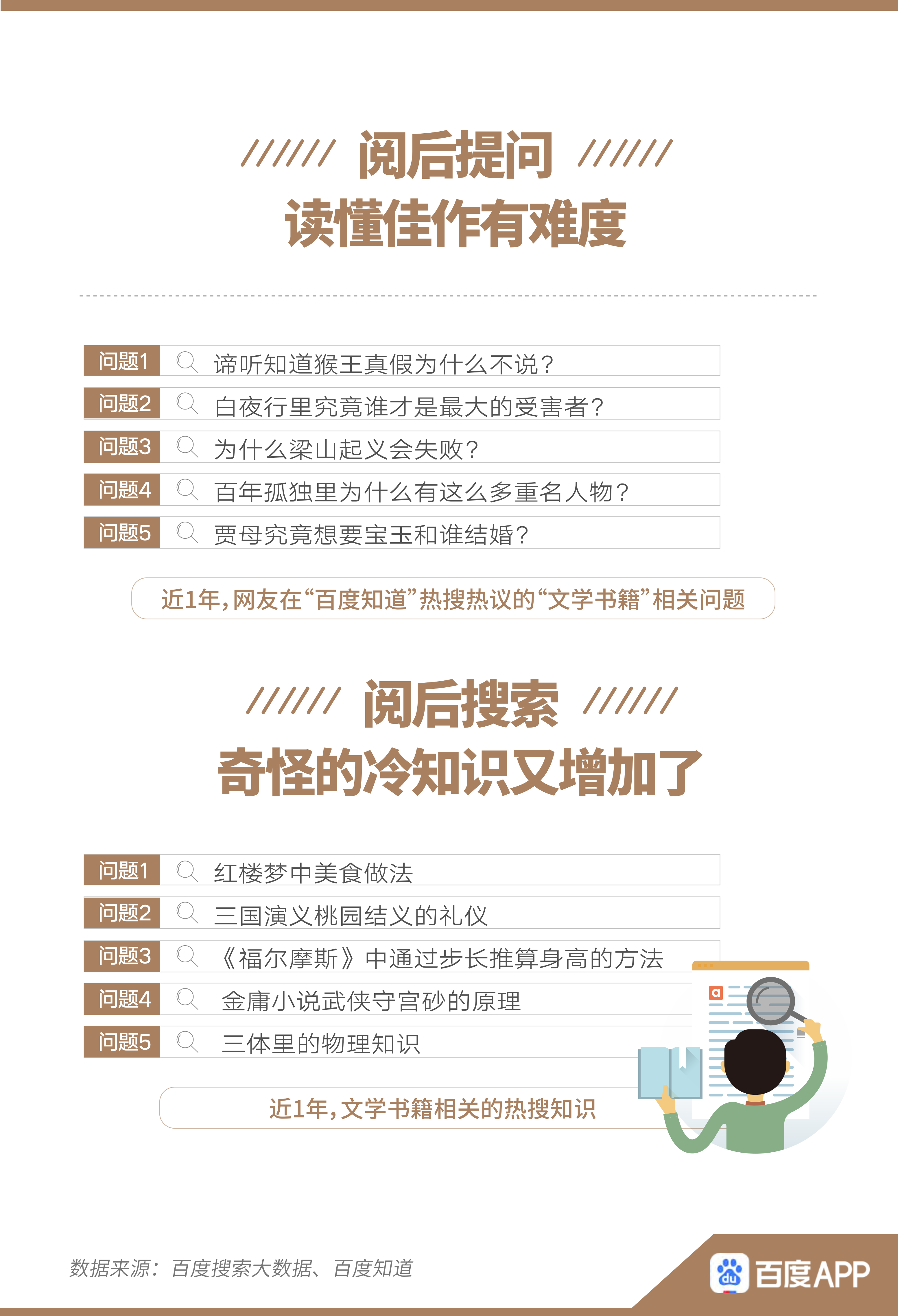 閱后提出對書籍的疑惑、討論思考、參與表達,均是讀者的重要需求。報告顯示,近1年,不少網(wǎng)友在閱讀之后,選擇到百度知道提問、討論。例如,“諦聽知道猴王真假為什么不說”、“白夜行究竟誰是最大受害者”等情節(jié)相關(guān)問題,均引起網(wǎng)友的熱搜熱議。除此之外,在百度搜索與主要情節(jié)無關(guān)的“冷”知識的人也不在少數(shù),如“紅樓夢中美食做法”、“三體里的物理知識”等。