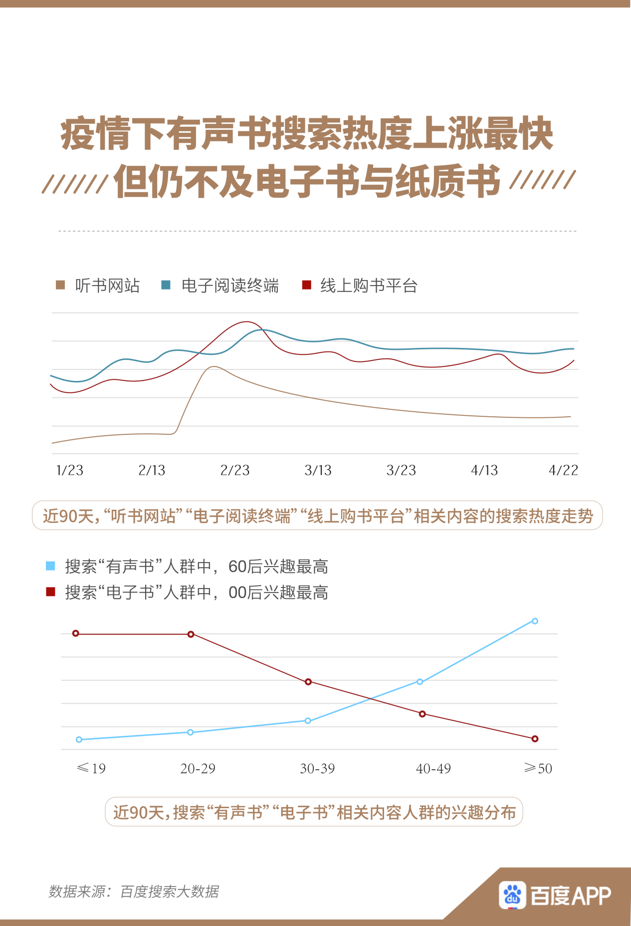 此外,在閱讀方式上,不同年齡也出現(xiàn)不同的偏好。疫情之下,“聽書網(wǎng)站”相關(guān)內(nèi)容的搜索熱度上漲趨勢明顯,但未能超越“電子閱讀終端”、“線上購書平臺”。在搜索“有聲書”人群中,60后的興趣最高,00后則更能接受“電子書”。