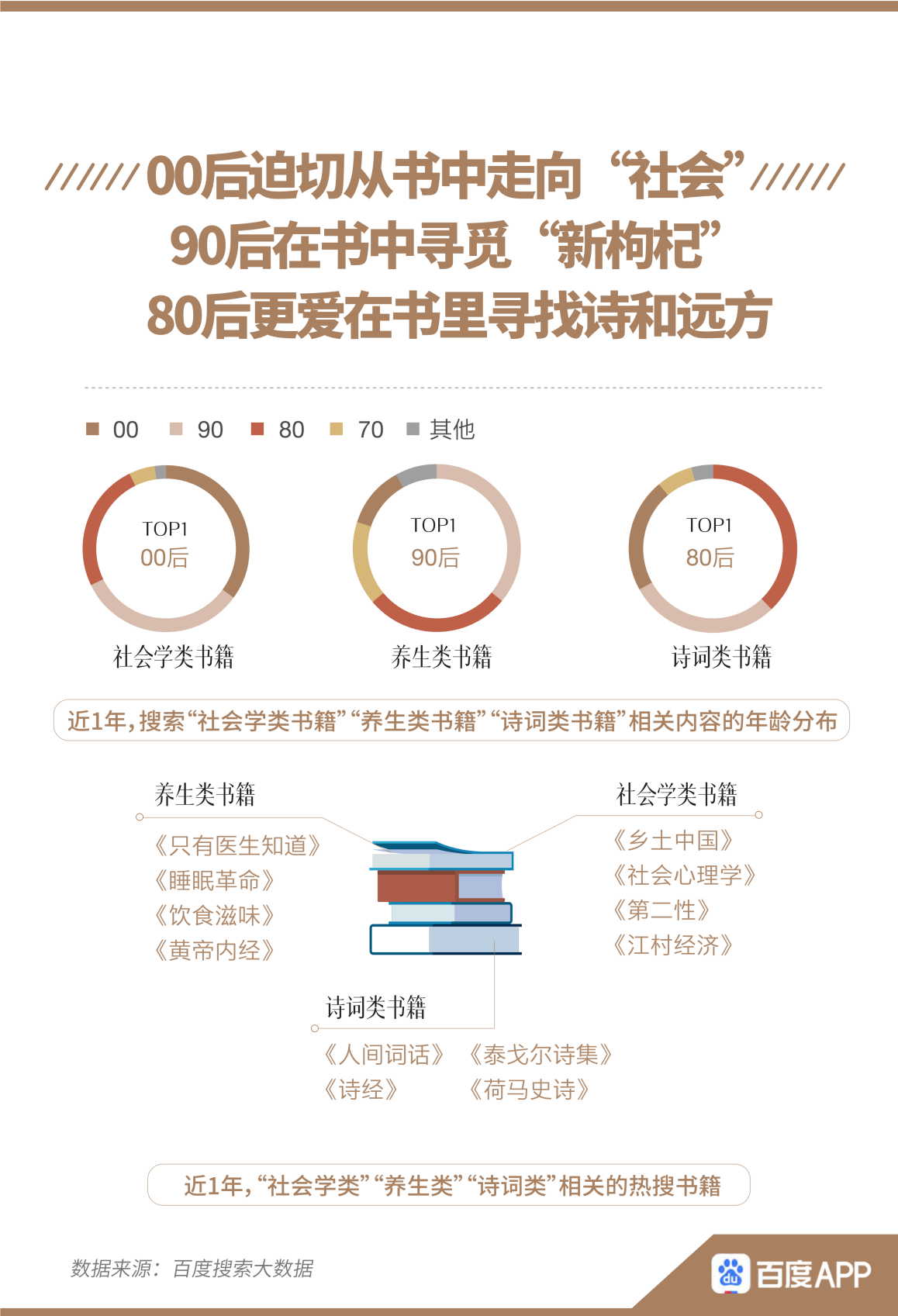 已經(jīng)步入而立之年的90后,開始關(guān)注“精神養(yǎng)生”。邊熬夜,邊閱讀《睡眠革命》、《只有醫(yī)生知道》等養(yǎng)生類書籍是他們的生活常態(tài)。而該養(yǎng)生的中年人不僅是閱讀小說的主力軍,也是搜索“詩詞書籍”最多的人群。