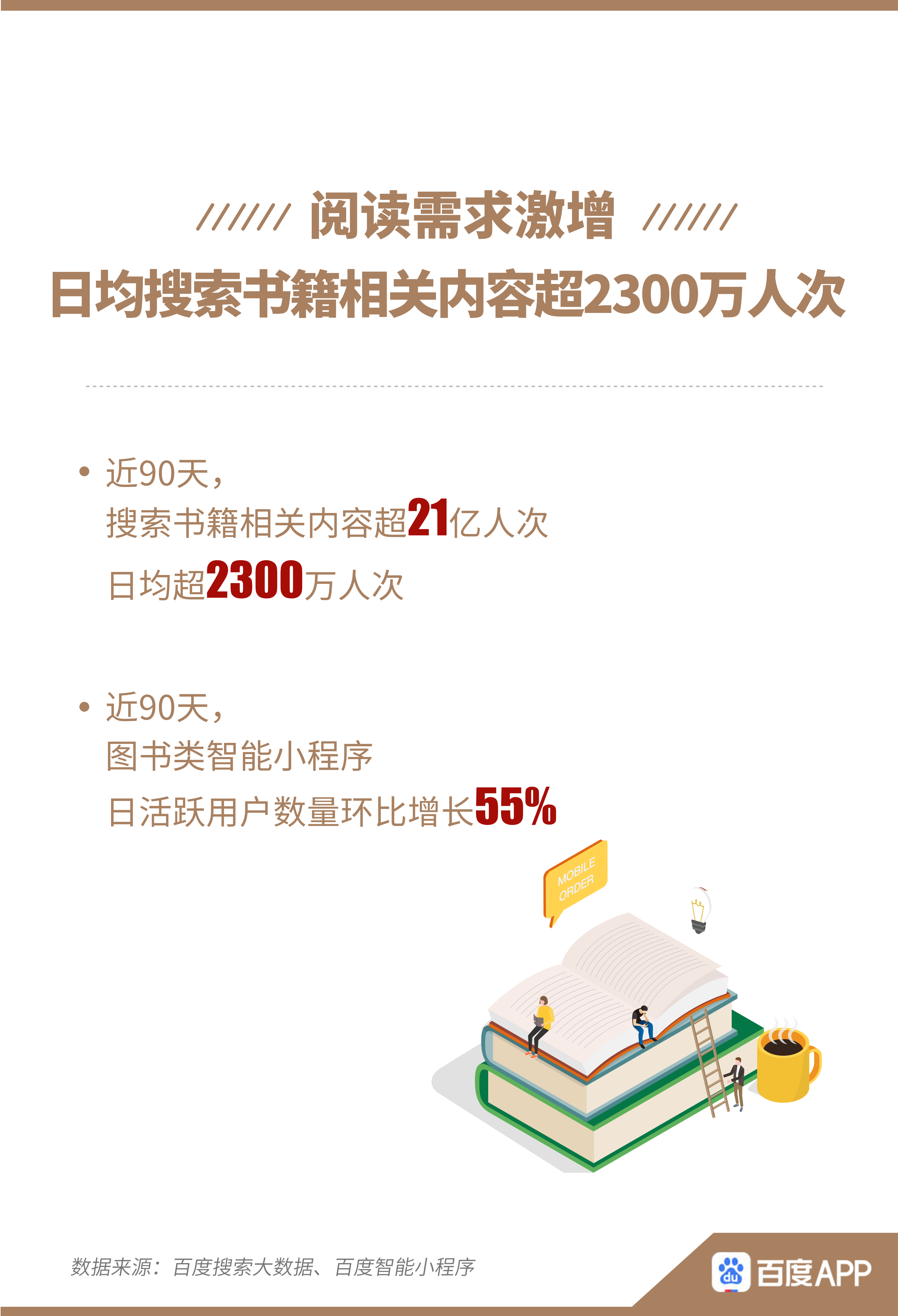 近日,百度APP聯(lián)合人民日報數(shù)字傳播《有數(shù)青年》工作室發(fā)布的《百度全民讀書搜索大數(shù)據(jù)報告》(以下簡稱“報告”)顯示,疫情宅家使網(wǎng)友閱讀需求激增,近90天,日均超2300萬人次在百度搜索書籍相關(guān)內(nèi)容,累計超21億人次,圖書類智能小程序日活躍用戶環(huán)比增長55%,讀書、購書線上化再進一步。
