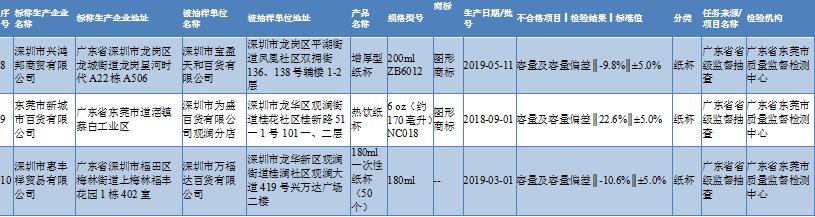 通告顯示,深圳抽檢的3批不合格樣品分別為深圳市寶盈天和百貨有限公司銷售的增厚型紙杯、為盛百貨有限公司觀瀾分店銷售的熱飲紙杯和萬福達百貨有限公司銷售的180ml一次性紙杯(50個),不合格項目均為容量及容量偏差不符合食品相關(guān)產(chǎn)品安全國家標(biāo)準(zhǔn)規(guī)定。