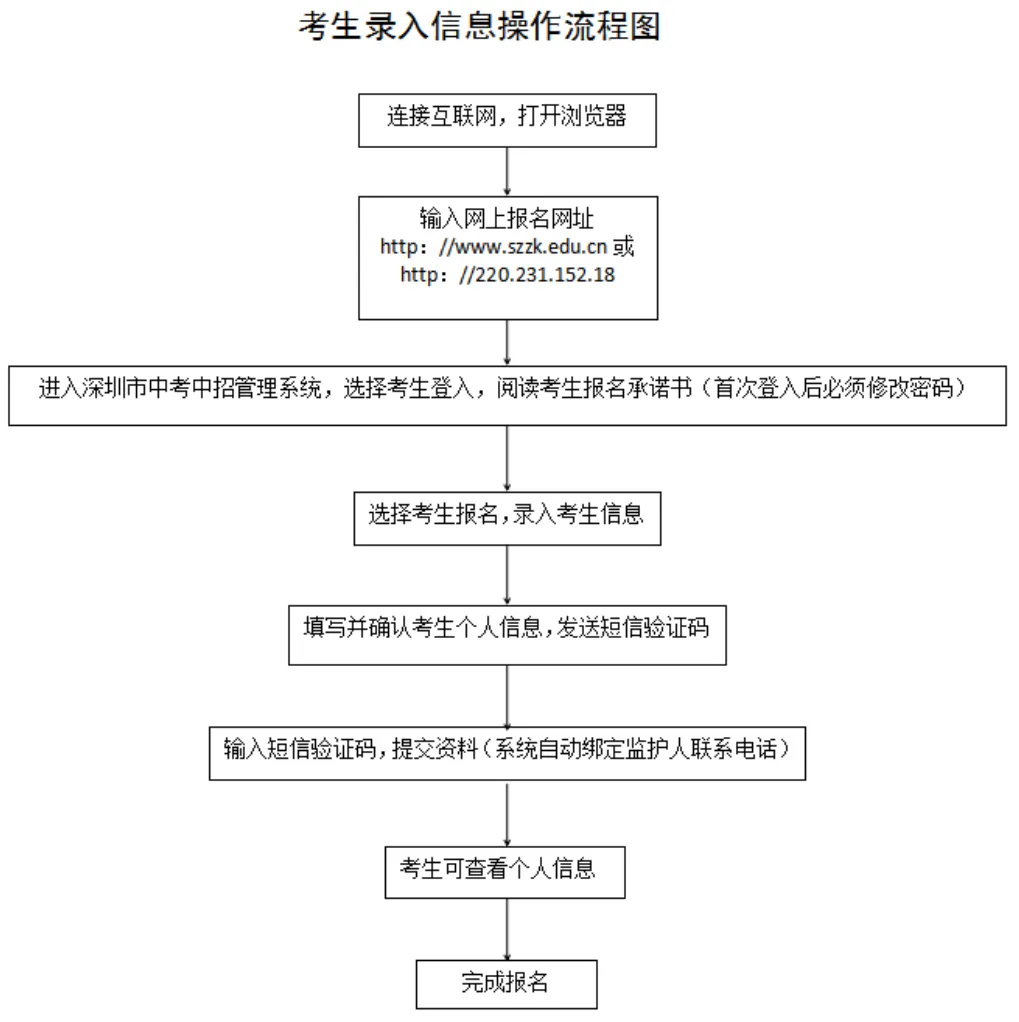 見圳客戶端·深圳新聞網(wǎng)2020年4月30日訊 據(jù)深圳市教育局消息,2020年深圳高中階段學校招生考試(以下簡稱“中考”)報名定于5月6日-15日進行,考試時間為7月20日-21日。 今年本市應屆初中畢業(yè)生仍繼續(xù)在就讀學校集體辦理報名手續(xù)。符合深圳中考報名條件的深圳戶籍往屆生、在市外就讀的深圳戶籍應屆初中畢業(yè)生(以下簡稱“社會類考生”)采用網(wǎng)上報名方式進行報名。 報名條件 一、具有我市戶籍的初中畢業(yè)生,可以在我市報名參加中考。 二、具有我市初三學籍的隨遷子女可以報名參加中考,同時符合以下條件的,可以參加相應的公辦普高、民辦普高和中職學校的劃線錄取。 (一)父親或母親在我市具有合法穩(wěn)定職業(yè); (二)父親或母親在我市具有合法穩(wěn)定住所; (三)父親或母親持有有效《深圳經(jīng)濟特區(qū)居住證》; (四)父親或母親在我市繳納基本養(yǎng)老保險及基本醫(yī)療保險,且至少其中一個險種累計繳費滿3年,社保累計年限計算截至2020年8月31日; (五)隨遷子女在我市具有3年完整初中學籍。 不符合上述條件但具有我市初中學籍的隨遷子女,可以在我市參加中考,但僅限于參加民辦普高補錄或中職學校注冊入學。 三、高中階段學校在校生不得報名。 本市應屆初中畢業(yè)生報名辦法 本市應屆初中畢業(yè)生于5月6日至7日在就讀學校集體辦理報名手續(xù)。 今年中考繼續(xù)實行網(wǎng)上報名。要求各學校開放計算機房,為本??忌暇W(wǎng)報名提供方便。 5月8日至15日,學校組織考生進行電子攝像,學校和考生分別上網(wǎng)錄入報名信息,考生錄入信息可參考“考生錄入信息流程圖”進行操作。 市教育局強調,學校不得以任何理由拒絕有本校學籍的應屆畢業(yè)生報考(參加中職學校自主招生、注冊入學的考生,也須報名參加中考)。如有違反者,將嚴肅查處,并追究相關人員責任。同時要求各區(qū)有關職能部門、各有關學校(報名點)要嚴格審查報名材料。對不符合報名條件、弄虛作假而被錄取的考生,一經(jīng)發(fā)現(xiàn),取消其錄取資格;已經(jīng)到錄取學校報到注冊的,取消其學籍,并追究相關人員責任。 社會類考生報名辦法 社會類考生采用網(wǎng)上報名方式進行報名。報名考生需在5月6日至15日登錄報名網(wǎng)址(http://www.szzk.edu.cn/),按照提示進行網(wǎng)上注冊,上傳報名審核資料,由考生戶籍所在區(qū)社會報名點進行線上審核,審核通過后系統(tǒng)將生成中考考生號及初始密碼,考生需用獲取的考號及密碼登錄中考中招管理系統(tǒng),填寫個人信息,具體操作可參考“考生錄入信息流程圖”。同時需在報名截止前根據(jù)指引完成網(wǎng)上繳費。 若考生網(wǎng)上報名審核不通過,需按照系統(tǒng)的不通過原因提示,重新補充審核資料,如多次上傳資料失敗或審核不通過,考生可撥打戶籍所在區(qū)的社會報名點電話進行咨詢或電話預約,按照工作人員指示進行操作報名,不要在未預約的情況下前往社會報名點,盡量避免出行,減少人員聚集。 社會類考生操作流程如下圖: 考生錄入信息操作流程如下圖: 中考社會報名點一覽表 深圳各類考生具體報考范圍、各類升學資格申報所需條件和材料以及相關報名要求,考生可通過深圳市招生考試辦公室官網(wǎng)(zkb.sz.gov.cn)及官方微信公眾號(深圳市招生考試辦公室)查閱,市招考辦也將第一時間通過上述渠道發(fā)布各類中考資訊。