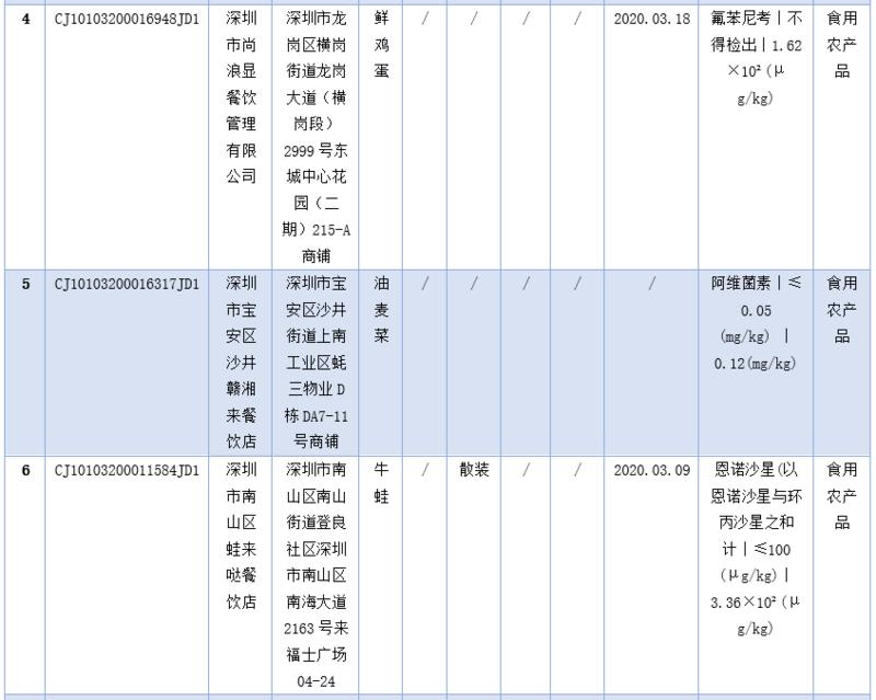 在不合格食品中,記者注意到,深圳市尚浪顯餐飲管理有限公司的鮮雞蛋及深圳市大汗食品有限公司的雞蛋均檢出氟苯尼考。據(jù)悉,氟苯尼考又稱氟甲砜霉素,是農(nóng)業(yè)部批準(zhǔn)使用的動(dòng)物專用抗菌藥,主要用于敏感細(xì)菌所致的豬、雞、魚的細(xì)菌性疾病?!秳?dòng)物性食品中獸藥最高殘留限量》中規(guī)定,氟苯尼考可用于豬、牛、羊、禽、魚等,在產(chǎn)蛋家禽中禁用(雞蛋、鵝蛋中不得檢出)。正常情況下消費(fèi)者不必對(duì)雞蛋、鵝蛋中檢出氟苯尼考過(guò)于擔(dān)心,但長(zhǎng)期食用氟苯尼考?xì)埩舫瑯?biāo)的蛋品,對(duì)人體健康有一定風(fēng)險(xiǎn)。