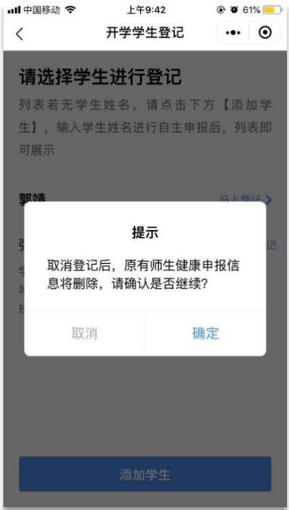 ②點擊“取消登記”,平臺彈出提示“取消登記后,原有師生健康申報信息將刪除,請確認(rèn)是否繼續(xù)?”,點擊“確定”,即取消成功。取消成功后,可重新進(jìn)行開學(xué)登記。