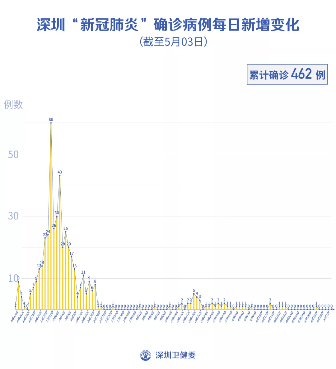 截至5月3日24時(shí),深圳累計(jì)報(bào)告新冠肺炎病例462例。5月3日當(dāng)天新增出院1例。
