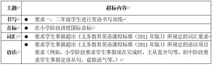 1.培訓(xùn)不得超出現(xiàn)行義務(wù)教育英語課程標準規(guī)定的各學(xué)段分級標準,禁止將初中知識類的教學(xué)內(nèi)容提前至小學(xué)教學(xué)與測評,禁止將現(xiàn)行普通高中英語課程標準規(guī)定的知識類教學(xué)內(nèi)容提前至初中教學(xué)與測評。