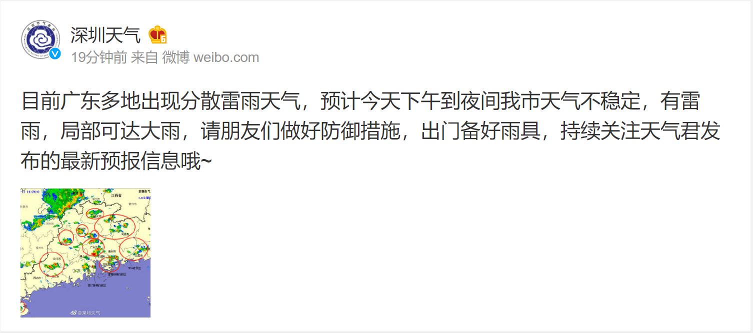 據(jù)@深圳天氣消息,目前廣東多地出現(xiàn)分散雷雨天氣,預(yù)計(jì)今天下午到夜間深圳天氣不穩(wěn)定,有雷雨,局部可達(dá)大雨,請(qǐng)大家做好防御措施,出門備好雨具,持續(xù)關(guān)注深圳天氣發(fā)布的最新預(yù)報(bào)信息。