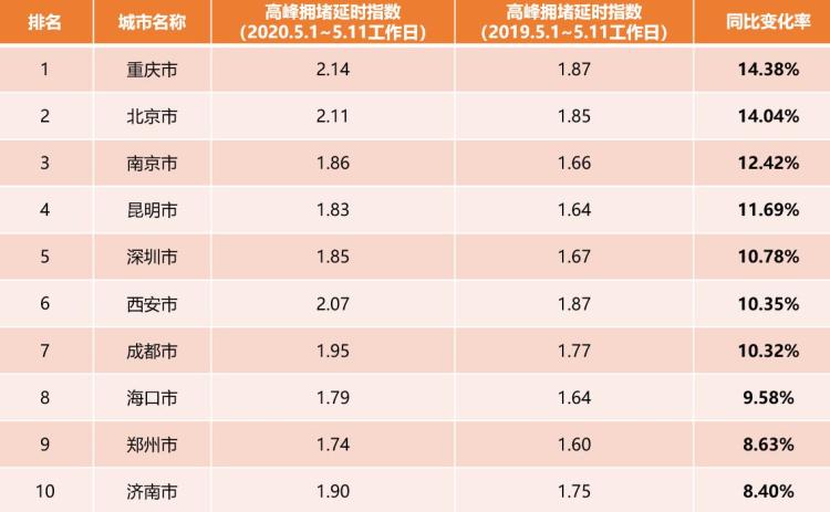 根據(jù)高德地圖監(jiān)測的50個主要城市交通數(shù)據(jù)顯示,5月1日至11日工作日相比2019年同期,重慶、北京、南京、昆明的高峰擁堵延時指數(shù)漲幅較大,同比變化率均超過11%,深圳、西安、成都同比變化率也超過10%。