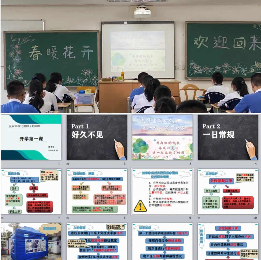學(xué)校在校門外設(shè)立進(jìn)入通道,讓學(xué)生按照提前設(shè)置好的路線指引, 分批分流 進(jìn)入校園。學(xué)校課室的課桌擺放呈“一人一桌”制,樓道貼上站位地標(biāo),充分拉開學(xué)生安全間距離, 少交談少聚集 。除此之外,學(xué)校通過取消課間操、眼操等方式壓縮課間,實(shí)現(xiàn) 錯(cuò)峰放學(xué) 。各班門前設(shè)置無接觸交作業(yè)區(qū),放置免洗洗手液,另外還特地為學(xué)生發(fā)放常規(guī)指引小冊(cè)子,制作了《寶安中學(xué)(集團(tuán))2020年春季學(xué)期返校復(fù)學(xué)指引》手繪視頻,開設(shè)了以防疫為主要內(nèi)容的“開學(xué)第一課”,讓防疫知識(shí) 入耳入腦入心 。