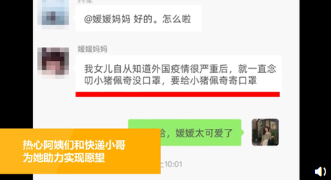 近日,三亞一小姑娘看到動(dòng)畫片里的小豬佩奇沒戴口罩特別著急,于是囑咐媽媽寄箱口罩給佩奇,還貼心地寫了英文信囑咐它。