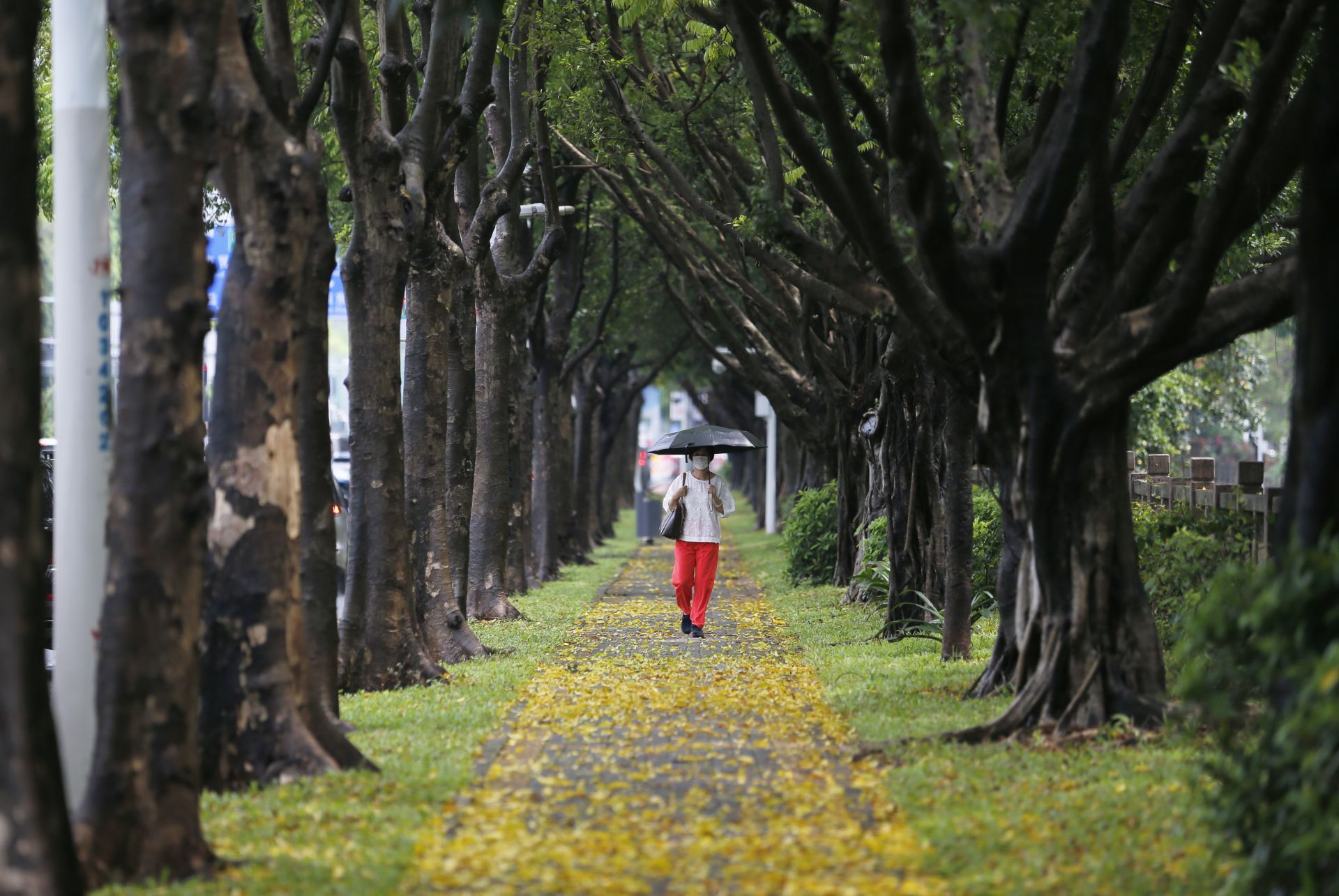2020年5月26日中午13:46分,商報(bào)東二路附近,短時(shí)強(qiáng)降水加上刮風(fēng),路面上都是樹(shù)葉,一位市民經(jīng)過(guò)。