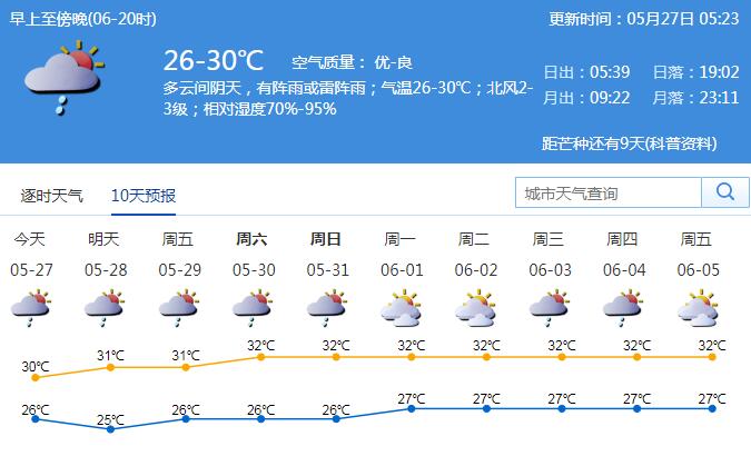 市氣象臺(tái)預(yù)測(cè),27日-31日多云天氣為主,部分時(shí)間有陣雨或雷陣雨,氣溫逐日升高,天氣轉(zhuǎn)熱。27日多云間陰天,有陣雨或雷陣雨;氣溫26-30℃;北風(fēng)2-3級(jí);相對(duì)濕度70%-95%。28-31日多云,可見(jiàn)陽(yáng)光,部分時(shí)間有(雷)陣雨。6月1-2日多云,局地有短時(shí)陣雨。