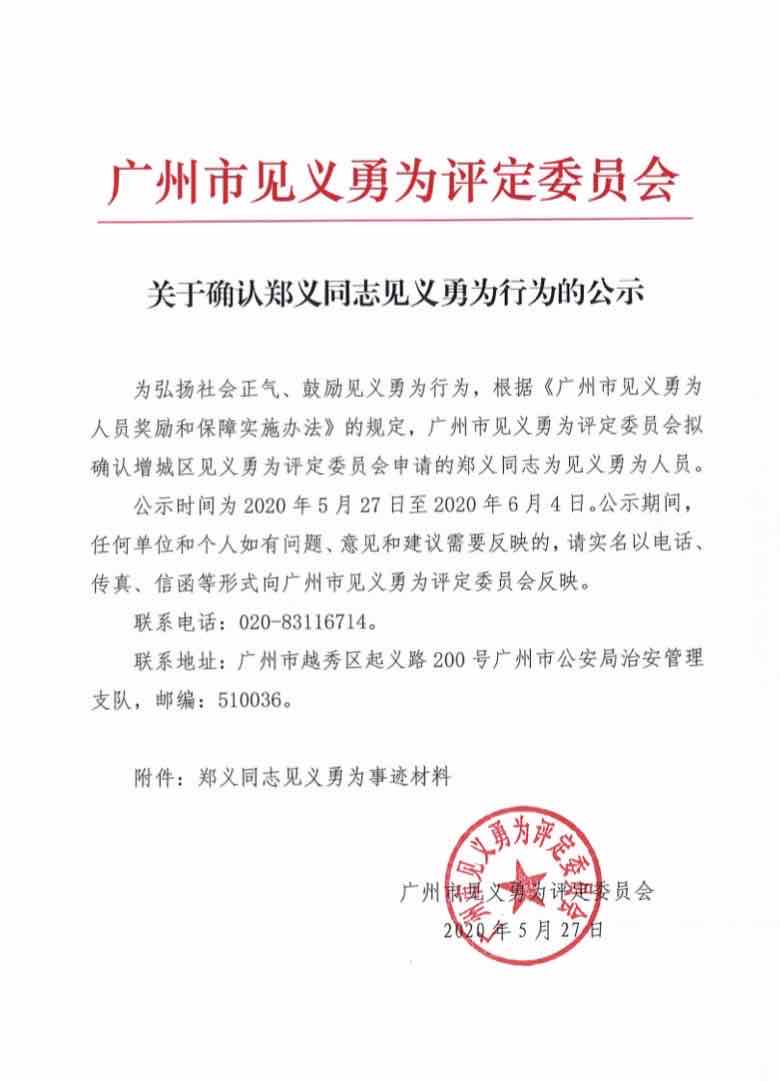5月27日,廣州市見義勇為評定委員會(huì)發(fā)出《關(guān)于確認(rèn)鄭義同志見義勇為行為的公示》,擬確認(rèn)鄭義同志為見義勇為人員。