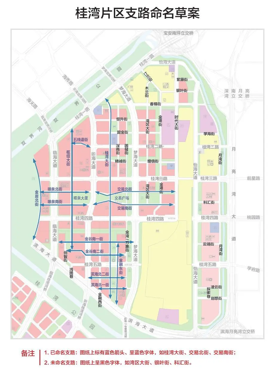 本次命名草案按照相關法規(guī)文件,結合前海桂灣、前灣、媽灣各片區(qū)的規(guī)劃定位、功能布局以及建設情況,針對三大片區(qū)和重要功能區(qū)功能、項目布局等特征,對前海15平方公里支路進行了全覆蓋命名。