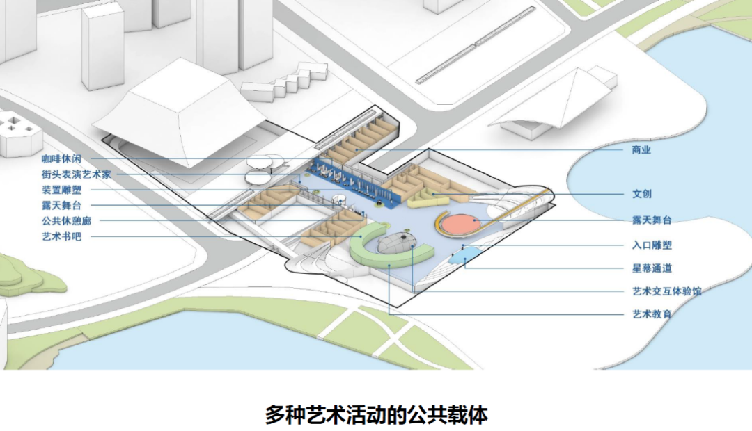 寬闊的藝術(shù)通道兩側(cè)是商業(yè)外擺和藝術(shù)展區(qū),具備咖啡輕食、休閑文創(chuàng)、裝置展區(qū)、藝術(shù)畫廊、街頭表演等功能區(qū)。