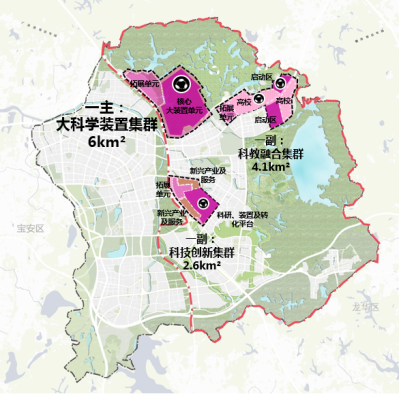光明科學(xué)城北起深莞邊界,東部和南部以光明區(qū)轄區(qū)為界,西部以龍大高速和東長路為界,規(guī)劃總面積99 平方公里。