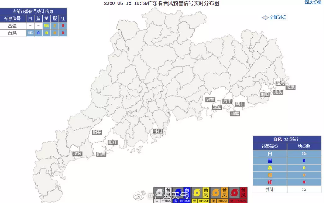 廣東省氣象局6月12日10時(shí)啟動(dòng)重大氣象災(zāi)害(臺(tái)風(fēng))三級(jí)應(yīng)急響應(yīng)。目前,廣東沿海陸陸續(xù)續(xù)臺(tái)風(fēng)白色預(yù)警信號(hào)都在亮起,深圳在2020年6月12日12時(shí)發(fā)布臺(tái)風(fēng)白色預(yù)警。