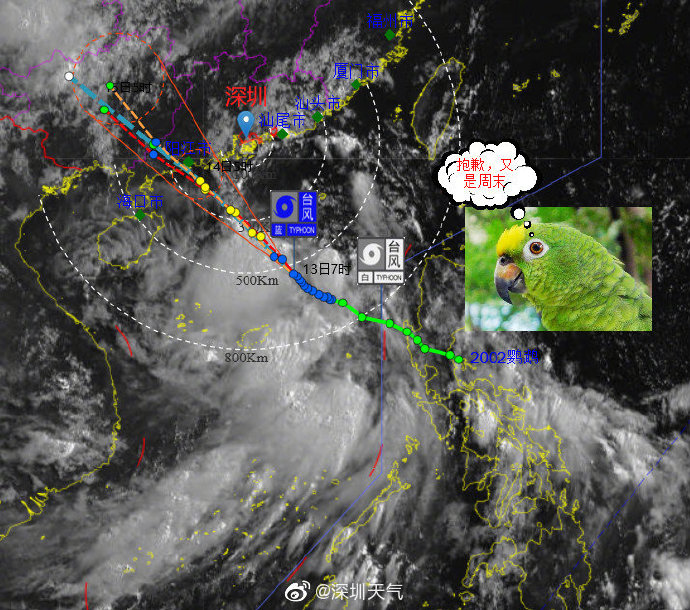 臺(tái)風(fēng)“鸚鵡”預(yù)計(jì)可能于14日08-10時(shí)在陽(yáng)江附近登陸。受其影響,14日上午深圳市沿海、高地和海區(qū)最大陣風(fēng)8級(jí)左右,午后風(fēng)力減弱;14日早晨到臺(tái)風(fēng)登陸前有間歇性陣雨,臺(tái)風(fēng)登陸后降雨趨于頻密,午后有大雨到暴雨,沿海和高地最大陣風(fēng)8-9級(jí),14日夜間降雨明顯減弱。