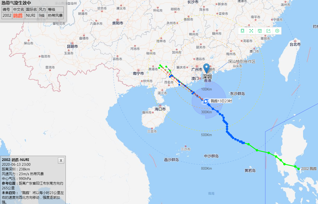 06月14日12時(shí),2002號(hào)臺(tái)風(fēng)“鸚鵡”(熱帶風(fēng)暴級(jí))的中心位于陽(yáng)江市陽(yáng)西縣,中心附近最大風(fēng)力8級(jí),向西北方向移動(dòng),強(qiáng)度逐漸減弱,下午將進(jìn)入廣西。截止目前深圳(含深汕)出現(xiàn)中雨局部大雨和6-9級(jí)陣風(fēng)。今天午后有間歇性(雷)陣雨,降雨時(shí)伴有6-7級(jí)陣風(fēng)。