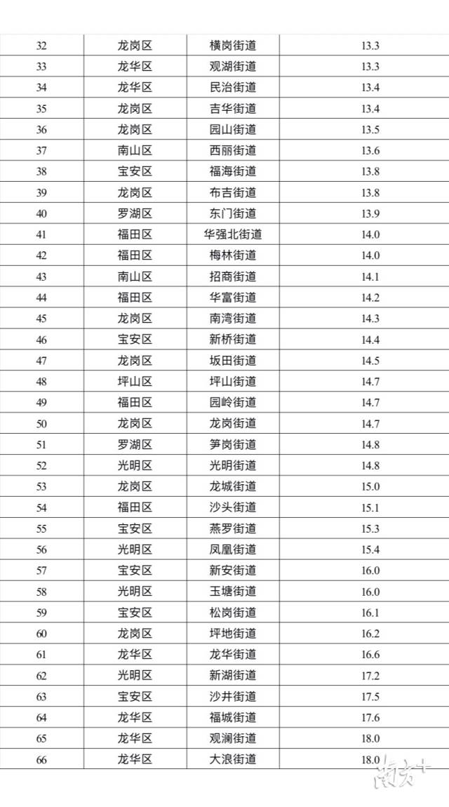 排名前十的街道是:海山、福保、桃源、南澳、葵涌、蓮塘、石巖、西鄉(xiāng)、蓮花和黃貝等街道;排名倒數(shù)前十的是:公明、馬田、龍?zhí)?、大浪、觀瀾、福城、沙井、新湖、龍華和坪地等街道。