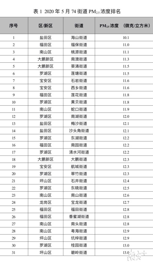南方網(wǎng)2020年6月15日訊 6月15日,深圳市生態(tài)環(huán)境局向社會通報了全市74個街道5月份PM2.5濃度排名情況。海山、福保、桃源、南澳、葵涌、蓮塘、石巖、西鄉(xiāng)、蓮花和黃貝等街道名列前十。