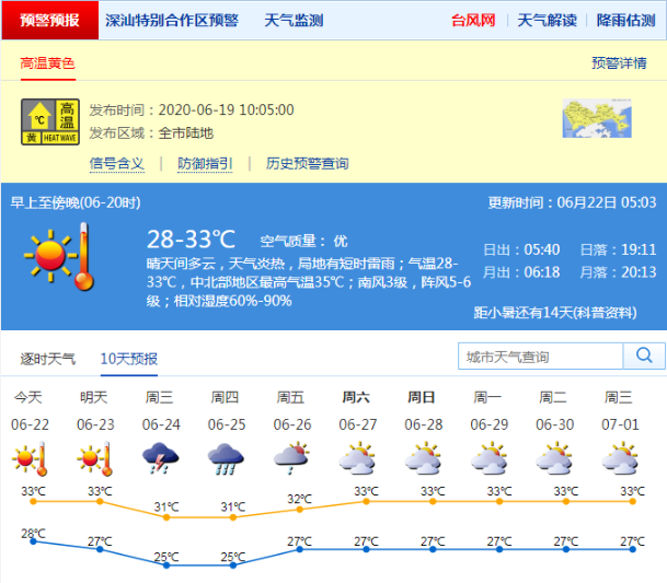 見圳客戶端?深圳新聞網(wǎng)2020年6月22日訊 據(jù)深圳氣象局消息,6月22日,深圳晴天間多云,天氣炎熱,局地有短時雷雨;氣溫28-33℃,中北部地區(qū)最高氣溫35℃;南風(fēng)3級,陣風(fēng)5-6級;相對濕度60%-90%。
