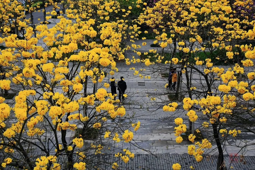 蓮花山公園入口處的鮮花吸引了兩位市民駐足觀看。