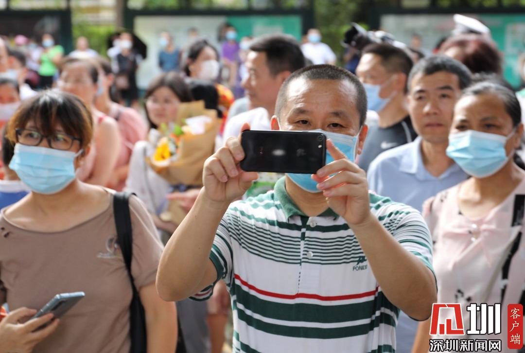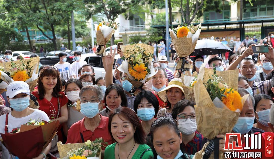 深圳高級中學(xué)考點(diǎn)外家長受捧鮮花、滿懷期待。