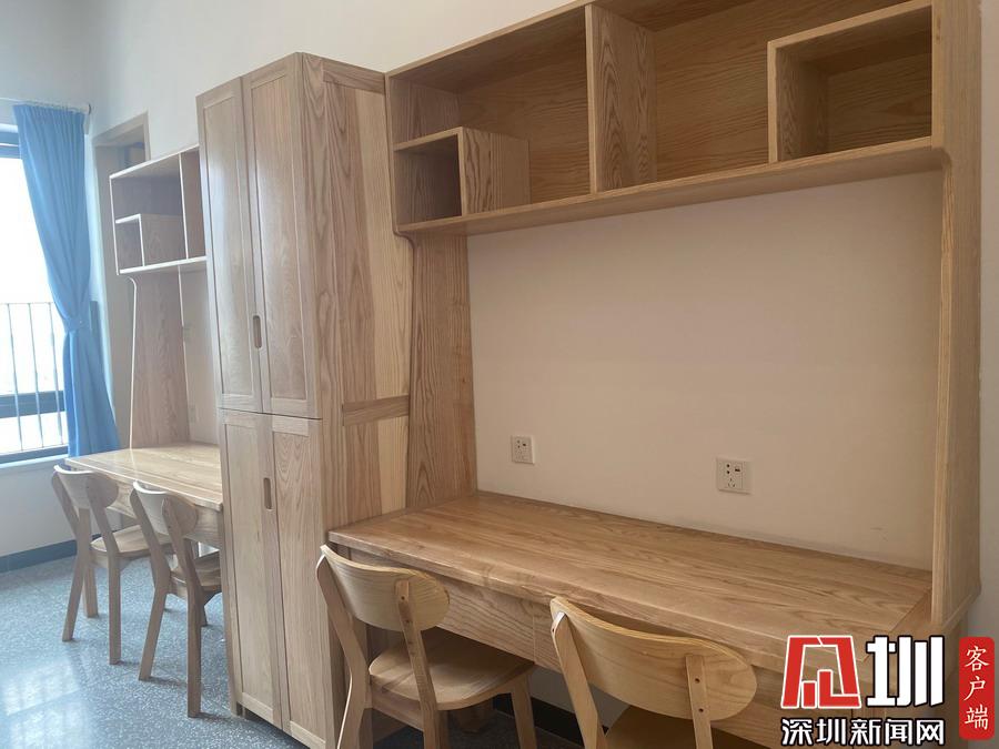 宿舍樓內,每套學生宿舍41.8平方米,采用2+1模式,2個獨立的房間各居住4人,一個共用衛(wèi)生間。一方面做到干濕分區(qū),臥室舒適度更好;另一方面做到學生分散,臥室靜謐性更好。同時,室內家具均采用“全實木+環(huán)保水性漆”,包括床、衣柜、書桌、書柜與椅子等;每一層宿舍樓均設有觀景平臺。此外,宿舍配備空調,太陽能熱水器,并在每棟宿舍二樓都設置了自助洗衣房。