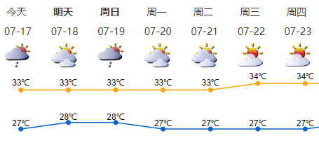 我市多云,局部有短時(shí)(雷)陣雨;氣溫27-33℃,中北部地區(qū)最高氣溫34-35℃;南風(fēng)3-4級,陣風(fēng)6級;相對濕度60%-95%。